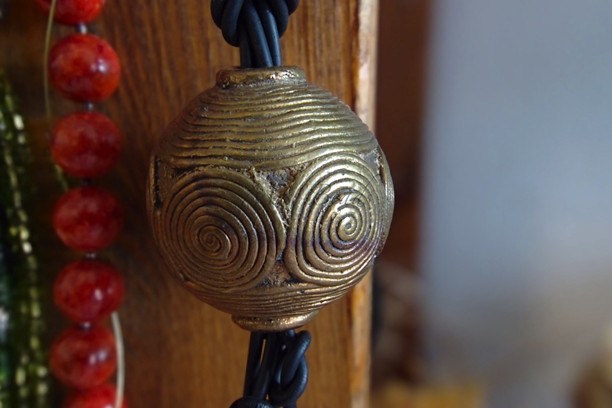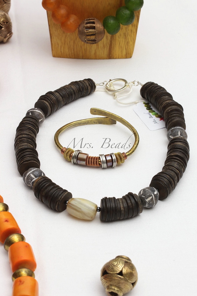 Kette: Kokosscheiben antik, Spinnwirtel aus Ton, Mali neu, Achatperle antik – früher Zahlungsmittel -
